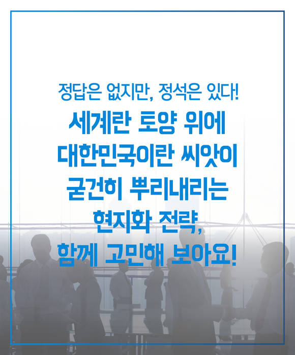 '정답은 없지만, 정석은 있다'라고 선언한 KT&G의 사례처럼, 세계라는 토양 위에 대한민국의 씨앗을 굳건히 뿌리내린 현지화 전략, 고민할 만한 경영전략인 듯합니다.