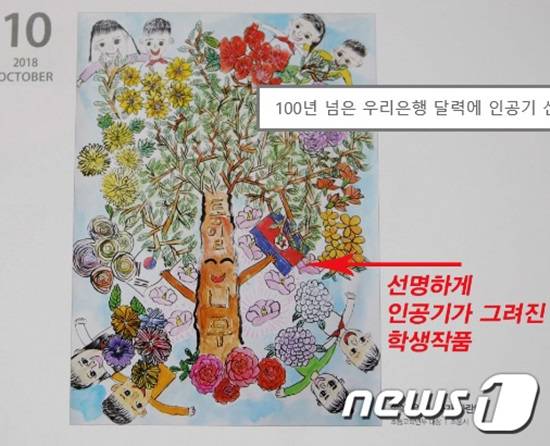 우리은행이 제작한 탁상달력 10월 면에는 통일을 주제로 '쑥쑥 우리나라가 자란다'는 제목의 그림이 실려 있다. 우리은행 달력 들어간 북한 인공기 사진은 학생들이 그린 것으로 알려졌다.