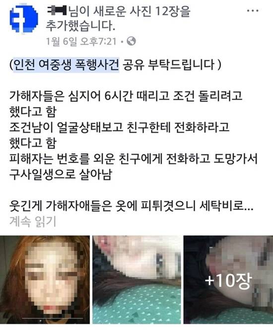 여고생 집단폭행 사건은 앞서 지난 6일 한 사회관계망서비스(SNS)에 ‘인천 여중생 집단 폭행사건’이라는 제목으로 눈 부위에 멍이 든 피해 여고생의 얼굴 사진 등이 올라와 누리꾼들의 공분을 샀다.