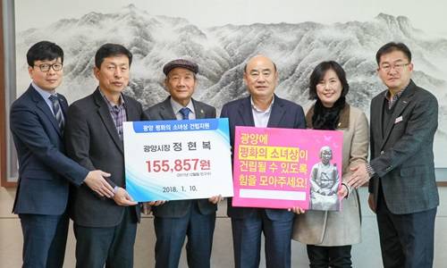 정현복 시장은 "우리 시에도 역사를 기억하고 바로 세울 수 있는 평화의 소녀상 건립이 추진되고 있어 뜻 깊게 생각한다"며 "광양시민 한 분 한 분의 마음을 함께 담는다는 의미에서 15만5857원을 기탁하게 됐다"고 말했다.