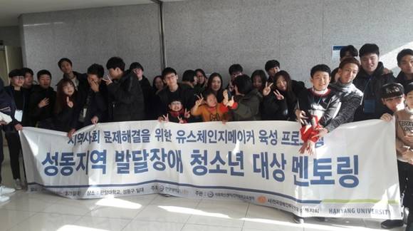 [프라임경제] 한양대학교 사회혁신센터(센터장 서진석) 대학생들이 서울 성동구 지역 발달지연 청소년 17명을 대상으로 한양대학교에서 멘토링 행사를 가졌어요. 한양대 대학생 25명이 방학을 맞은 발달지연 청소년들과 함께 즐거운 시간을 보냈어요. 참석한 사람들이 단체사진을 찍었어요. = 박마틴 객원기자