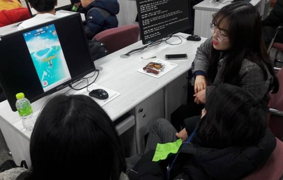 한양대학교 사회대 컴퓨터실에서 발달지연 청소년이 대학생 멘토에게 도움을 받으면서 유튜브에서 다른 사람이 게임하는 것을 보고 있어요. 게임의 이름은 '뽀로로 펭귄 런'인데요, 게임을 잘하는 사람의 영상을 보면서 기뻐했어요. 직접 게임을 하진 않았지만 함께 기쁨을 나눴네요. = 박마틴 객원기자