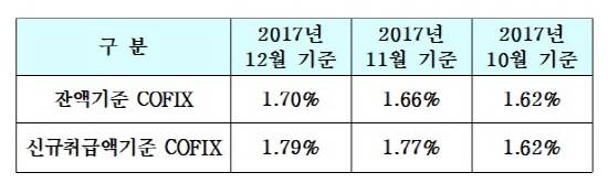 16일 전국은행연합회에 따르면 지난해 12월 신규 취급액 기준 코픽스는 1.79%로 전달보다 0.02%포인트 올랐다. 이는 2015년 3월(1.91%) 이후 2년 9개월 만의 최고치다. 신규취급액 코픽스는 지난해 8월(1.47%)부터 오름세를 나타냈다. 신규 코픽스는 매달 은행들이 새로 조달한 자금으로 산출돼 시장금리가 신속히 반영된다.