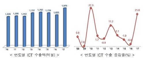 16일 과학기술정보통신부(장관 유영민, 이하 과기정통부)가 발표한 2017년 ICT 수출입 동향 자료를 보면, 지난해 ICT 수출은 1976억달러(약 210조4835억원), 수입은 1021억달러(약 108조7467억원), 수지는 956억달러(약 101조8331억원) 흑자로 잠정집계됐다.