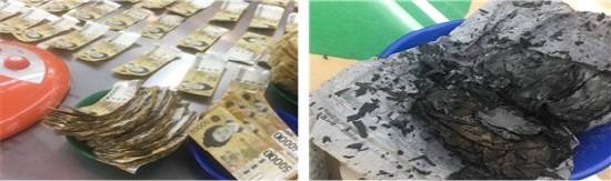한국은행 관계자는 "불에 탄 상태 그대로 원래 은행권의 모양이 최대한 유지될 수 있도록 재를 털어 내거나 쓸어내지 말고 상자나 용기에 담아 운반해야 한다"며 "은행권이 금고, 지갑 등 보관용기에 든 상태로 불에 타서 용기로부터 은행권을 꺼내기 어려운 경우에는 보관용기 상태로 운반해야한다"고 설명했다.