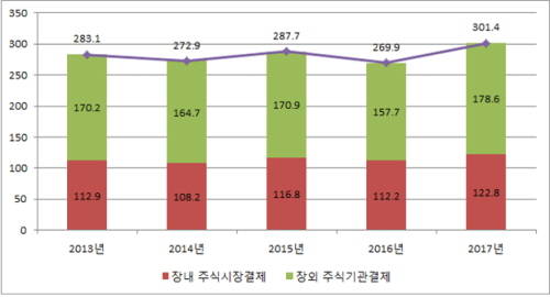 16일 한국예탁결제원에 따르면 예탁결제원을 통한 증권결제대금 중 주식결제대금 총액은 301조4000억원(일평균 1조2000억원)으로 2016년 총액 269조9000억원(일평균 1조1000억원) 대비 11.7% 증가했다.
