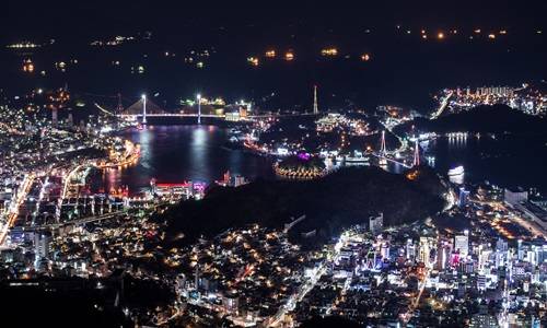 [프라임경제] 지난 15일 오후 구봉산 정상에서 본 여수 야경. 사진 왼쪽 중앙동 해변을 따라 해양공원, 그 위로 거북선대교가 있다. 가운데는 장군도, 오른쪽은 돌산대교다. 여수를 낭만의 도시로 만든 여수밤바다 야경은 해마다 수많은 관광객들을 이끌고 있다.