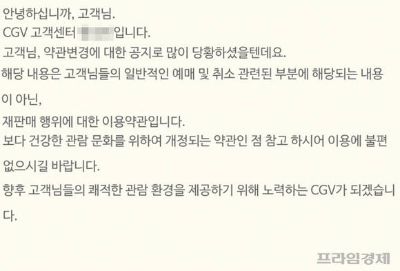 [프라임경제] CJ CGV(079160·이하 CGV)가 2회 이상 예매를 취소할 경우 회원자격을 박탈하거나 누적 포인트를 삭제할 수 있도록 하는 내용의 약관개정을 예고했지만 불과 하루 만에 사실상 철회했다. 개정된 약관의 문제점을 지적한 본지 단독보도 직후 결정된 사항이다.