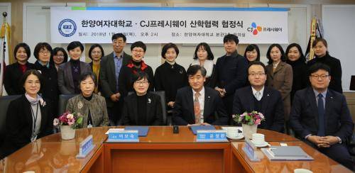 CJ프레시웨이는 18일 한양여자대학교(이하 한양여대) 본관 2층 회의실에서 한양여대와 식품산업 전문 인재 양성, 기술정보 교류 등 상호 동반 성장을 위한 산학협력을 체결했다.
