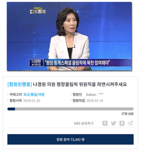 서명에 참여한 이들은 나 의원과 자유한국당이 평화의 상징인 올림픽을 정쟁에 이용하면서 그동안의 외교적 수고를 물거품으로 만들고 있다며 불만을 토로하는 상황이다.