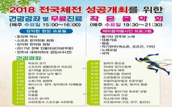 [프라임경제] 익산시(시장 정헌율)는 '2018전국체전및전국장애인체전' 시민홍보와 함께 건강한 도시를 만들기 위한 건강강좌및한방무료진료와 작은 음악회를 매주 개최한다고 22일 밝혔다.