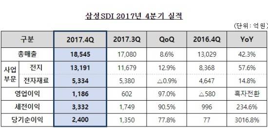 [프라임경제] 삼성SDI(006400)는 23일 실적발표 컨퍼런스 콜을 통해 지난해 매출 6조3216억원, 영업이익 1169억원을 기록하며 지난 2014년 이후 3년 만에 흑자로 전환했다고 밝혔다.