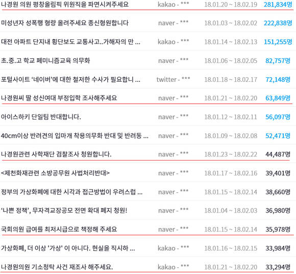 선두주자인 나경원 의원의 조직위원 파면 청원에는 30일 현재까지 28만명이 넘는 시민들이 참여했다. 최단시간, 최다동의 기록을 돌파한 것으로 가상화폐 규제 관련 안건과 미성년자 성폭행 형량 강화 청원 등과 함께 청와대의 답변만 기다리는 상황이다.