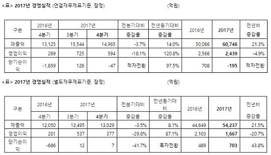 지난해 4분기에만 매출은 전년 동기 대비 14.0% 증가한 1조4965억원을 기록했고, 영업이익은 120.8% 증가해 594억원을 기록했다. 다만 연결 대상 및 관계사 이익 감소분과 법인세 비용 증가로 당기 순손실 47억원이 발생했다.