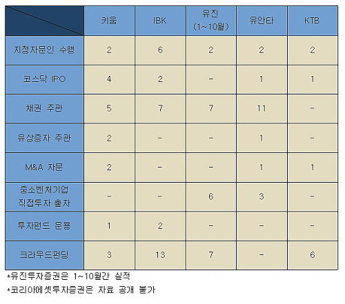 가장 늦게 중기특화증권사로 선정된 KTB투자증권의 경우 크라우드펀딩에서 6건의 성공을 거뒀으나 지정자문인 수행 2건, 코스닥 IPO 1건, M&A자문 1건에 그쳐 타 증권사 대비 부진했다.