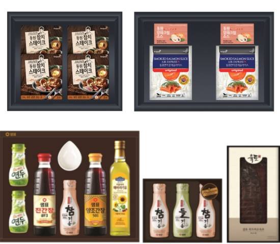 먼저 참치 선물세트는 '동원참치스테이크 세트'를 주력으로 한다. 동원참치스테이크는 고급 황다랑어 통살을 두툼하게 썰어 유명 프렌치 레스토랑 '루이쌍끄(Louis Cinq)'의 이유석 셰프와 공동 개발한 특제 간장버터 소스로 풍미를 더한 제품이다.