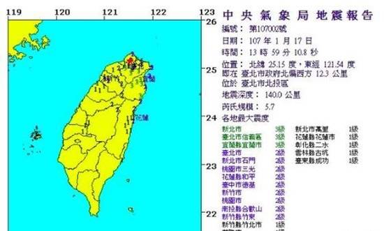 대만 타이베이에서 17일(현지시간) 규모 5.7의 강진이 발생했다고 대만 중앙기상청(CWB)이 밝혔다.