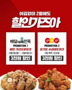 먼저 오는 9일까지 배달앱 배달의민족을 통해 치킨을 주문하면 모든 메뉴를 3000원 할인가에 제공한다. 아울러 요기요에서는 이달 매주 금요일 주문 시 전 메뉴를 3000원 할인가에 즐길 수 있다.