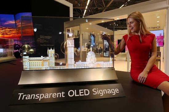 LG전자는 △투명 강화유리에 앞뒤로 두 장의 올레드를 붙인 '인글라스(In-Glass) 올레드 사이니지' △4㎜ 이하의 얇은 두께로 벽과의 일체감이 탁월한 '올레드 월페이퍼' △베젤이 3.5㎜까지 얇아진 '올레드 비디오월' 등 다양한 올레드 사이니지 제품을 내세웠다.