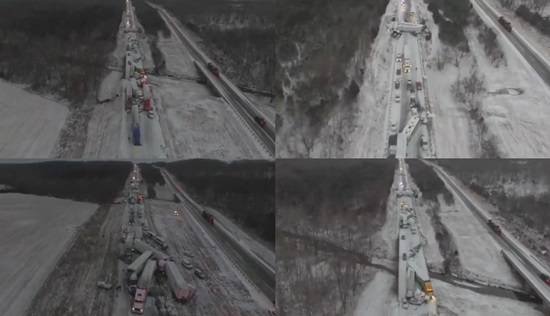 고속도로 상공에서 촬영한 영상을 봐도 눈은 도로와 인근 산을 뒤덮고 있다. 눈길로 변한 고속도로 위에는 트레일러와 승용차 등이 뒤엉켜 아수라장으로 변해 있다.