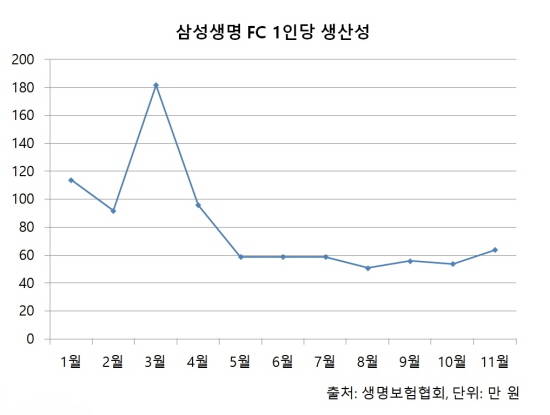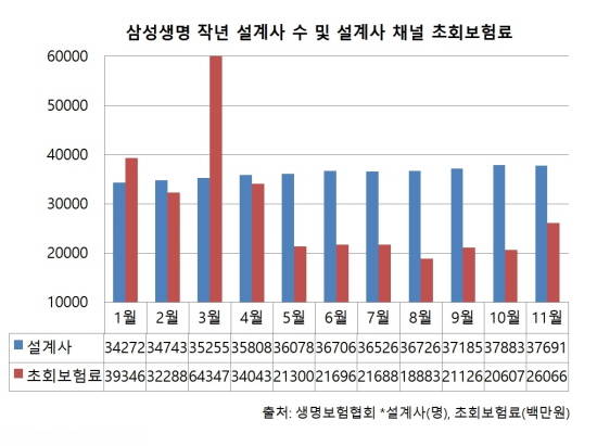 6일 생명보험협회에 따르면 지난해 11월 기준 삼성생명의 설계사는 3만7691명으로 1월보다 3419명 증가했으나 같은 기간 설계사 채널의 초회보험료는 132억8000만원 줄었다.