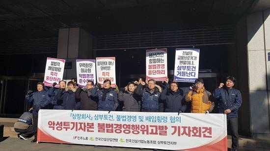 민주노총 삼부토건지부 사무국장은 "노동조합은 회사의 회생 종결 후 신임 사장과 '공정한 기업운영을 위한 정책협약'을 체결하는 등 삼부토건의 새로운 도약을 위해 힘써 왔지만 최근 회사의 경영을 좌지우지하는 비선라인이 따로 존재한다는 사실을 인지했다"고 주장했다.
