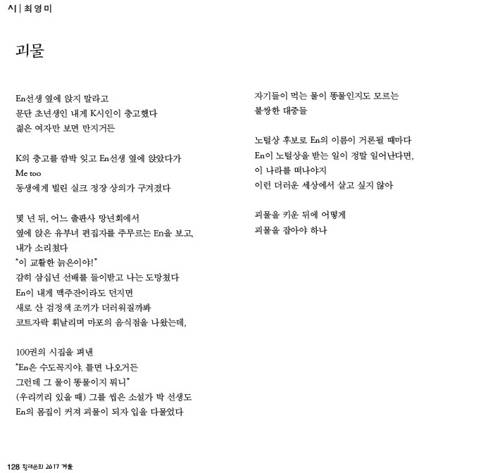 최영미 시인의 '괴물'은 계간 '황해문화' 2017년 겨울호에 실린 것으로, 문학계 성추행을 고발하는 내용을 담고 있어 주목을 받는다.