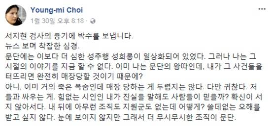 한편 최영미 시인은 지난달 30일 자신의 페이스북에 검찰 내부 성추행 실태를 고발한 서지현 검사를 응원하는 글을 올렸다.