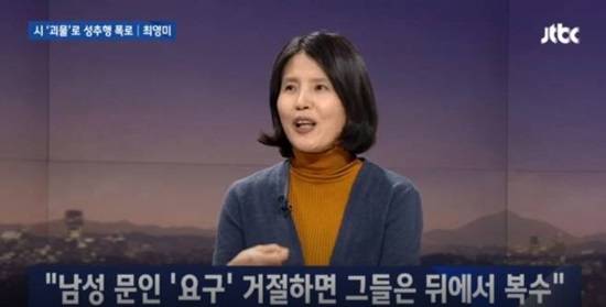 최영미 시인(57)이 풍자시를 통해 문단의 한 원로시인을 성추행을 저지르는 '괴물'로 표현한 데 이어 방송 인터뷰에서도 "(성폭력의) 상습범"이라고 비판했기 때문.