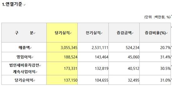 별도 기준으로는 매출은 1조9275억원으로 전년 대비 19% 증가했으며, 영업이익은 1259억을 기록하며 55.8% 급성장했다.