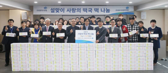 [프라임경제] DGB금융그룹 DGB사회공헌재단은 7일 대구시사회복지협의회(회장 이재모)에서 '설맞이 사랑의 떡국 나눔' 행사를 개최해 가래떡 2kg상자 600박스(600만원 상당)를 장애인직업재활시설협회(회장 이종균)과 장애인그룹홈지원센터(센터장 이영민)에 전달했다.