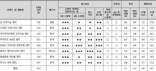 한편, 어린이제품 공통안전기준과 안전확인 안전기준 부속서10(어린이용 일회용 기저귀)에 따른 pH, 폼알데하이드 등 유해물질 시험 결과 모든 제품이 안전기준에 적합했다.