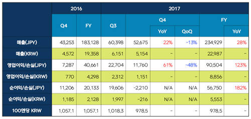 넥슨은 2017년 △매출 2조2987억원 △영업이익 8856억원 △순이익 5553억원으로 전년 대비 각각 28%, 123%, 182% 성장했으며, 4분기 △매출 5154억원 △영업이익 1151억원 △순손실 216억원으로 각각 22%, 61%, 22% 성장한 것으로 나타났다.