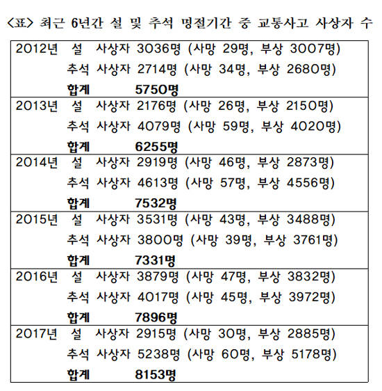 9일 국회 행정안전위원회 소속 홍철호 자유한국당 의원에 따르면 2012년부터 지난해까지 명절 기간 발생한 교통사고 사상자 수는 5750명에서 8153명으로 41.8% 증가했다.