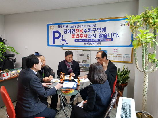 이번 별사랑마을 2-2단지를 방문해 통장, 마을대표(관리소장)와 장애인전용 불법주차 예방 강구 및 애로사항에 대한 서로의 의견을 나눴으며, 안내홍보물 게시 등 주민홍보에 적극 협조해줄 것을 요청했다.