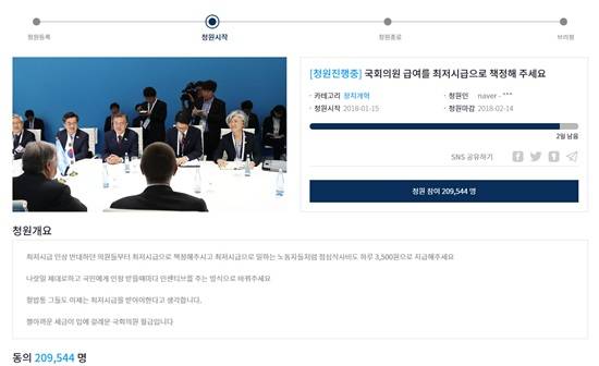 지난 1월 15일 청와대 국민청원게시판에 게시된 '국회의원 급여를 최저시급으로 책정해 주세요'라는 제목의 청원글이 청원 마감 이틀을 앞두고 청와대 공식답변 조건을 충족했다.