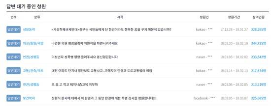 현재 '가상화폐 규제 반대', '나경원 의원 평창동계올림픽 조직위원 파면', '미성년자 성폭행 형량 강화' 등의 국민청원이 답변을 기다리고 있다.