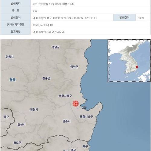 13일 오전 6시 30분쯤 경북 포항시 북구 북서쪽 5km 지역에서 규모 2.6의 지진이 발생했다.