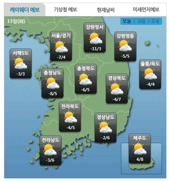 한편 기압골의 영향을 받아 14일은 경기 동부와 강원영서에 눈이 내릴 전망이다. 설날 연휴인 15일(금)과 18일(일)은 제주도에 비가 오겠다고 케이웨더는 밝혔다.