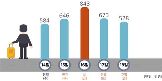 이번 설 특별교통대책기간(14~18일) 중 예상 이동인원은 작년 설(3천201만 명) 대비 2.3%(73만 명) 증가한 총 3천274만 명이고, 설 당일에 최대 843만 명이 이동할 것으로 전망된다.