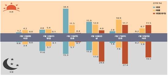 설문 조사결과 귀성은 설 전날인 15일(목)에 집중될 것으로 예상되며, 귀경(귀가) 시에는 차례를 지낸 후 여행을 떠나는 나들이객의 교통량과 귀경객 교통량이 동시에 집중되어 설 당일인 16일(금)과 다음날인 17일(토)에 교통 혼잡이 예상된다.