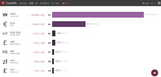 한편, 현재 비트코인 가격은 가상화폐 통계 사이트 코인힐스 기준 1196만원 대에 거래되고 있으며, 전체 비트코인 중 국내 거래소 거래 비중은 11.13%를 차지하고 있다.