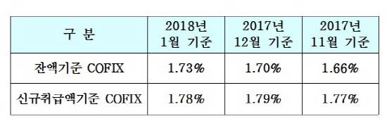 19일 전국은행연합회가 발표한 '2018년 1월 코픽스 공시'에 따르면 지난 1월 신규 취급액 기준 코픽스는 1.78%로 전달보다 0.01%포인트 떨어졌다.