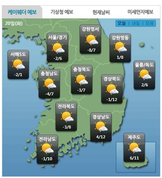 아침기온 서울과 대구 -2℃, 춘천 -6℃, 전주 -3℃, 강릉 1℃로 시작하겠고, 한낮에는 서울 6℃, 춘천 7℃, 전주와 강릉 9℃, 대구 11℃까지 오르겠다. 다만 일교차가 커 건강관리에 유의해야한다.