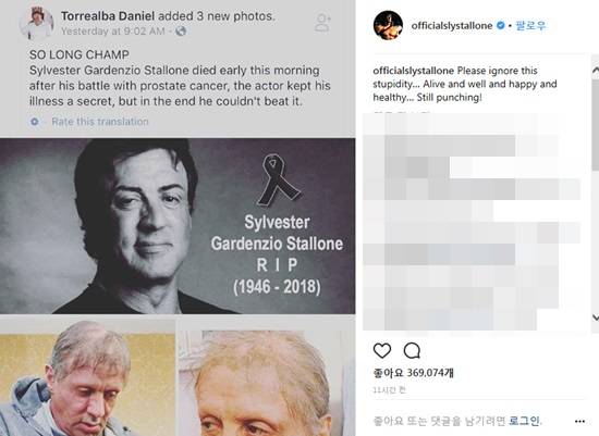 실베스터 스탤론은 19일(현지시각) 인스타그램에 자신이 사망했다는 내용의 '가짜뉴스'를 캡처해 게시한 뒤 "이런 바보같은 소리는 무시하라"고 말했다.