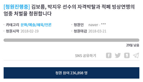 청원자는 "스피드 스케이팅 여자 팀추월 소속 김보름, 박지우 선수는 개인 영달에 눈이 멀어 동료인 노선영 선수를 버리고 본인들만 앞서 나갔다"며 이들의 국가대표 자격박탈과 국제대회 출전 정지를 요구했다.