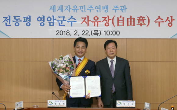[프라임경제] 전동평 영암군수가 22일 세계자유민주연맹(WLFD․총재 야오잉치)이 수여하는 세계자유민주연맹 '자유장'을 수상했다.