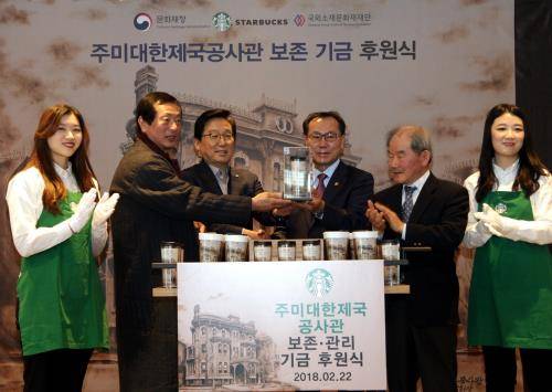 [프라임경제] 스타벅스커피코리아가 삼일절 앞두고 22일 스타벅스 더종로점에서 '주미대한제국공사관 보존 기금 후원식'을 열고 문화재청과 국외소재문화재재단에 주미대한제국공사관 보존 기금 1억원을 전달했다.