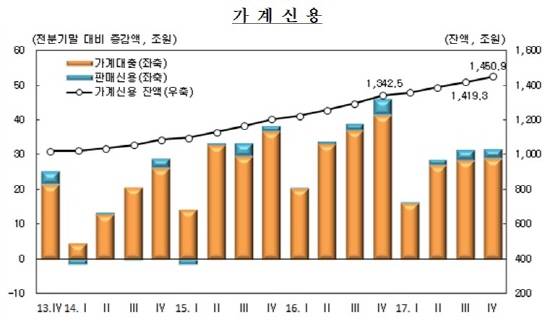 22일 한국은행이 발표한 '2017 4분기 중 가계신용'에 따르면 12월말 가계신용 잔액은 1450조9000억원으로 집계됐다.