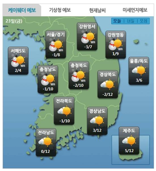 주말인 24일(내일)은 경기 동부와 강원 영서에 눈이, 25일(일)은 강원영동과 영남해안, 제주도에 눈이나 비가 올 것으로 예상된다.